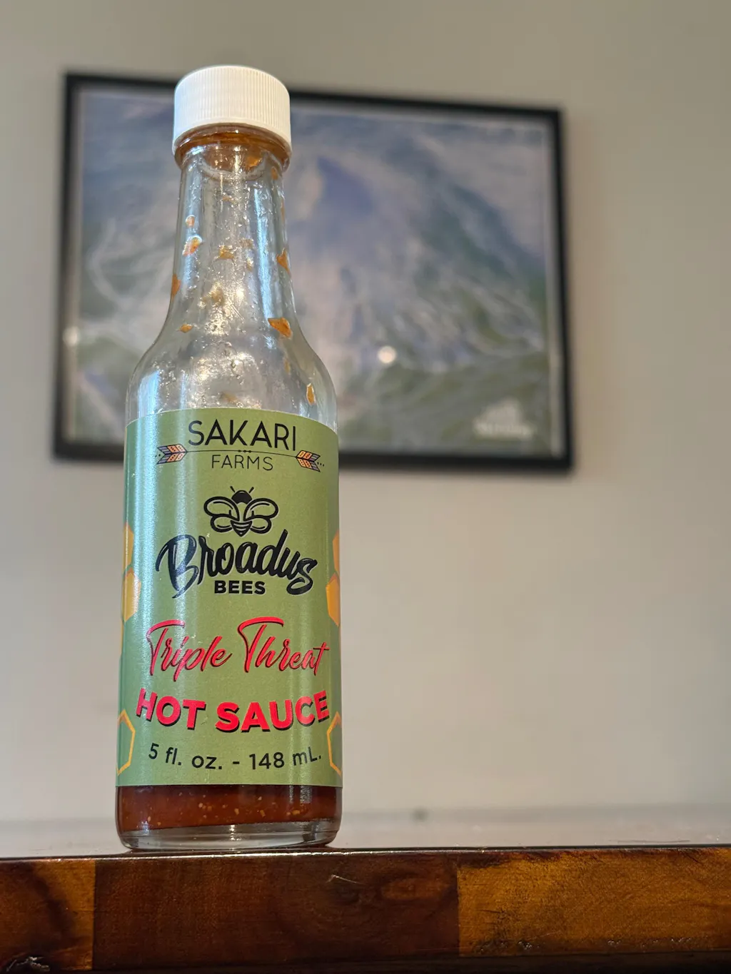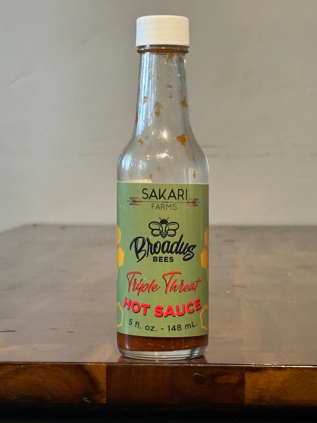 A collaboration between Sakari farms and Broadus Bees. This hot sauce delivers a perfect Trifecta combination of Local Broadus Bees Wildflower Honey, Local Sakari Habaneros, and Local Whiskey that has a lot of flavor, smoke, and sweetness along with a sting at the end with some spiciness. Great on eggs, tacos, chicken, and ice cream!